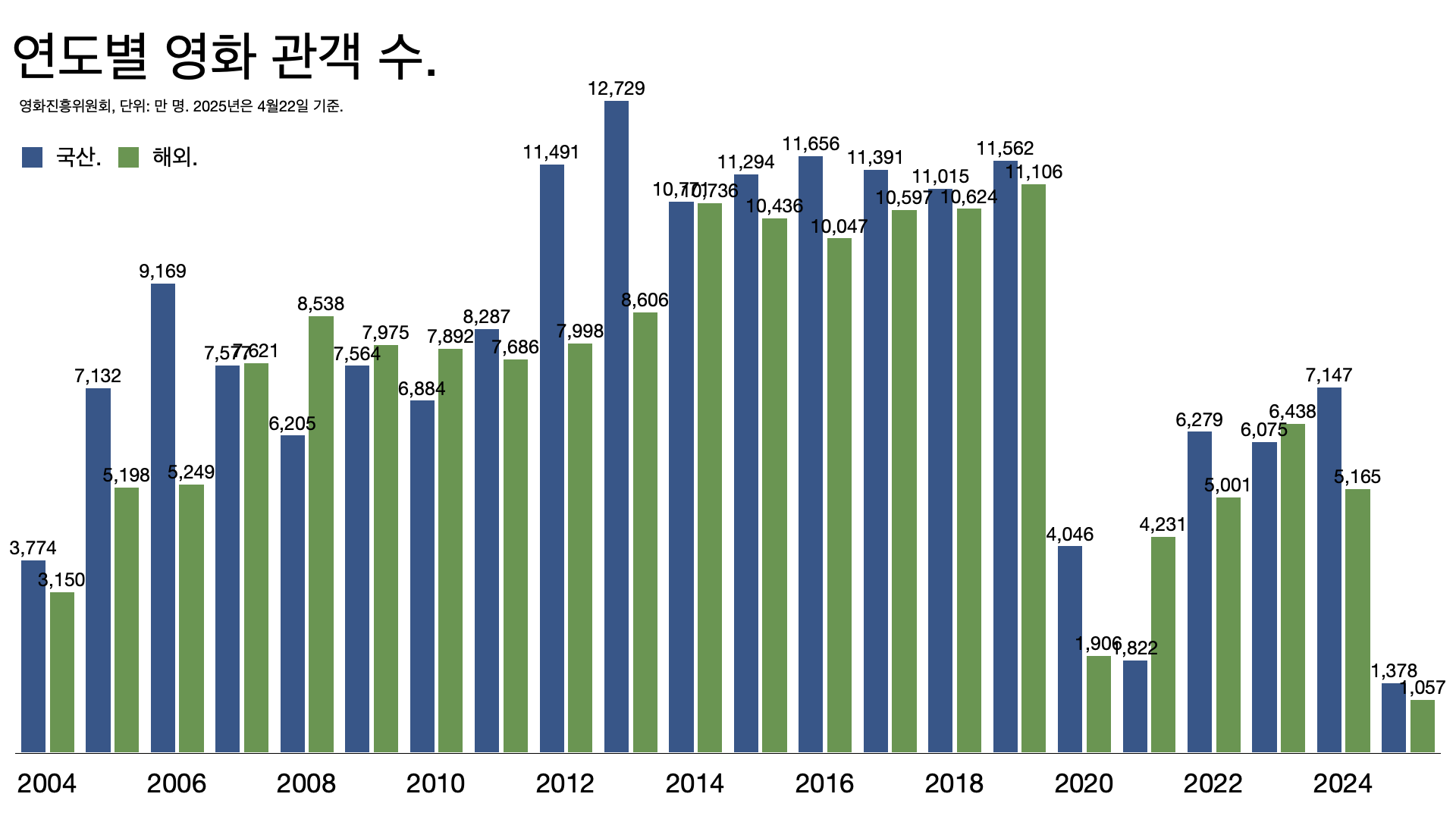 - 제작 편수와 관객 수 추이를 보면 코로나 팬데믹 이후 크게 꺾이는 추세를 확인할 수 있습니다.