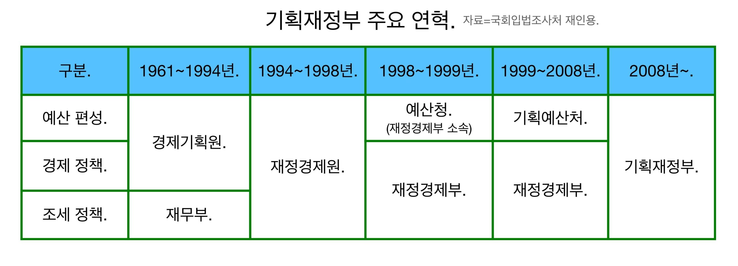 - 잠시 기재부 연혁을 볼 필요가 있다. 김대중·노무현 정부(1999~2008년)는 ①‘예산 편성’을 담당하는 기획예산처와 ②‘경제 정책’과 ③‘조세 정책’을 담당하는 재정경제부로 나누었다.