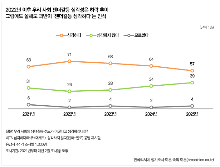 - 심각한 사회 갈등을 방치하지 않는 이재명 태도는 평가할 만하다. 한국리서치가 2021년부터 매년 2월 실시하는 젠더 갈등 인식 조사를 보면 응답자의 57%는 ‘우리 사회 남녀 갈등이 심각하다’고 밝혔다. 이 수치는 문재인 정부 때인 2022년 2월 71%로 최고점을 찍은 뒤 하락 추이를 보이고 있다.