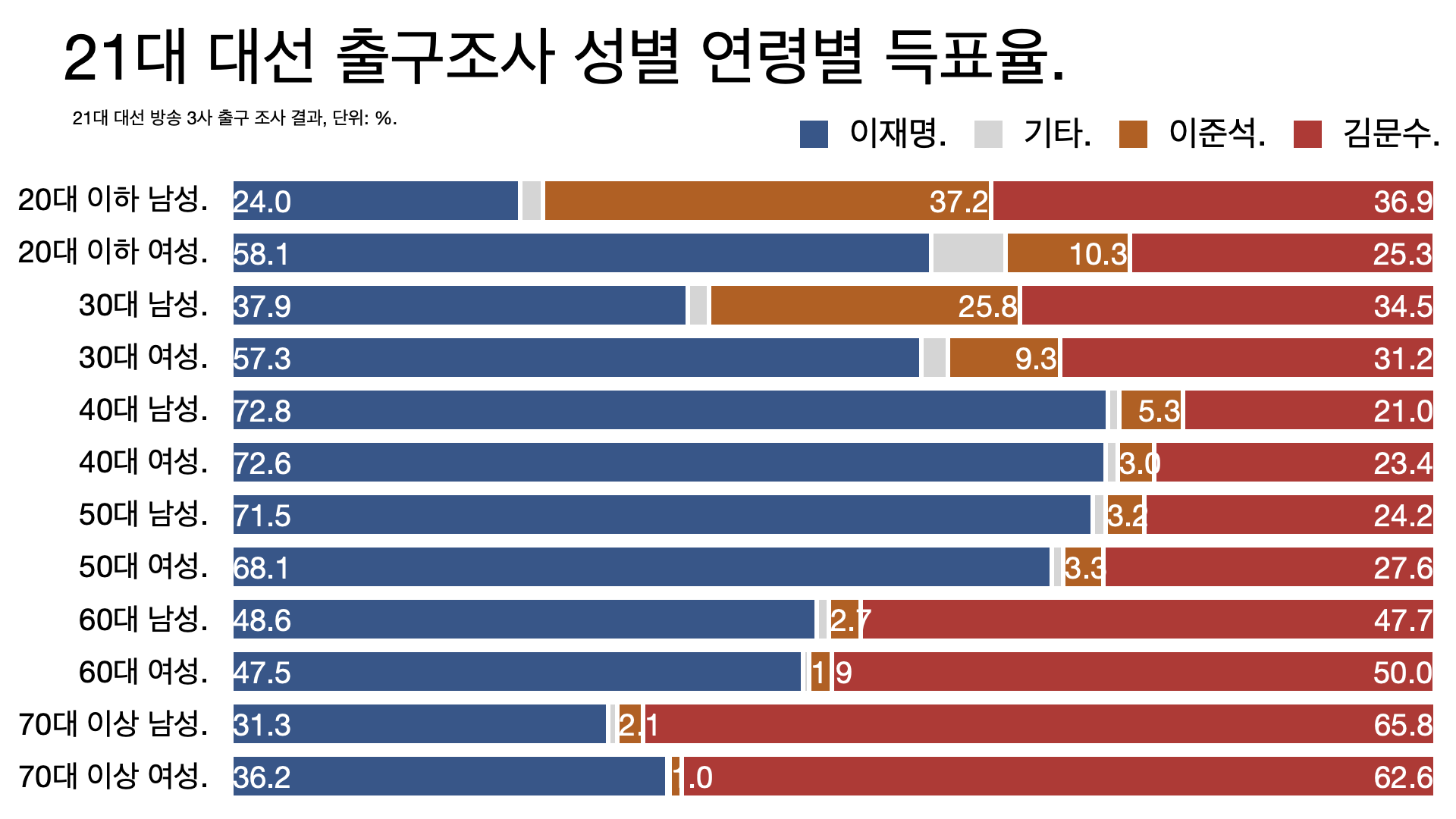 - 문재인 정부 정책 기조에 변화는 없었다. 문 정부에 등 돌린 ‘이대남’ 표심은 2021년 4·7 서울시장 보궐선거에서 국민의힘 후보 오세훈에게 몰표를 주는 것으로 돌아왔다. 지상파 3사 출구조사에 따르면, 20대 남성 72.5%가 오세훈을 찍었다. 30대 남성 63.8%도 오세훈을 택했다. 윤석열과 이재명이 맞붙은 2022년 대선에서도 20대 남성 58.7%가 윤석열을 뽑았다. 이재명을 선택한 20대 남성은 36.3%에 그쳤다.