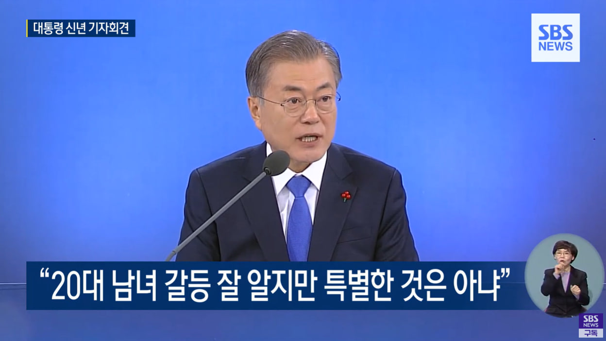 - 성별 갈등 문제를 방치했던 문재인 정부와는 다른 태도다. 문재인은 2019년 1월 기자회견에서 ‘20대 남녀의 국정 지지도가 큰 차이를 보이고 있다’는 기자 지적에 “젊은 남녀 사이 젠더 갈등이 있다는 걸 잘 알고 있다. 하지만 그것이 특별하다고 생각하지 않는다. 사회가 바뀌는 과정에서 생기는 갈등”이라며 “그런 갈등을 겪으면서 사회가 성숙한 방향으로 나아갈 것이라 생각한다”고 일축했다.