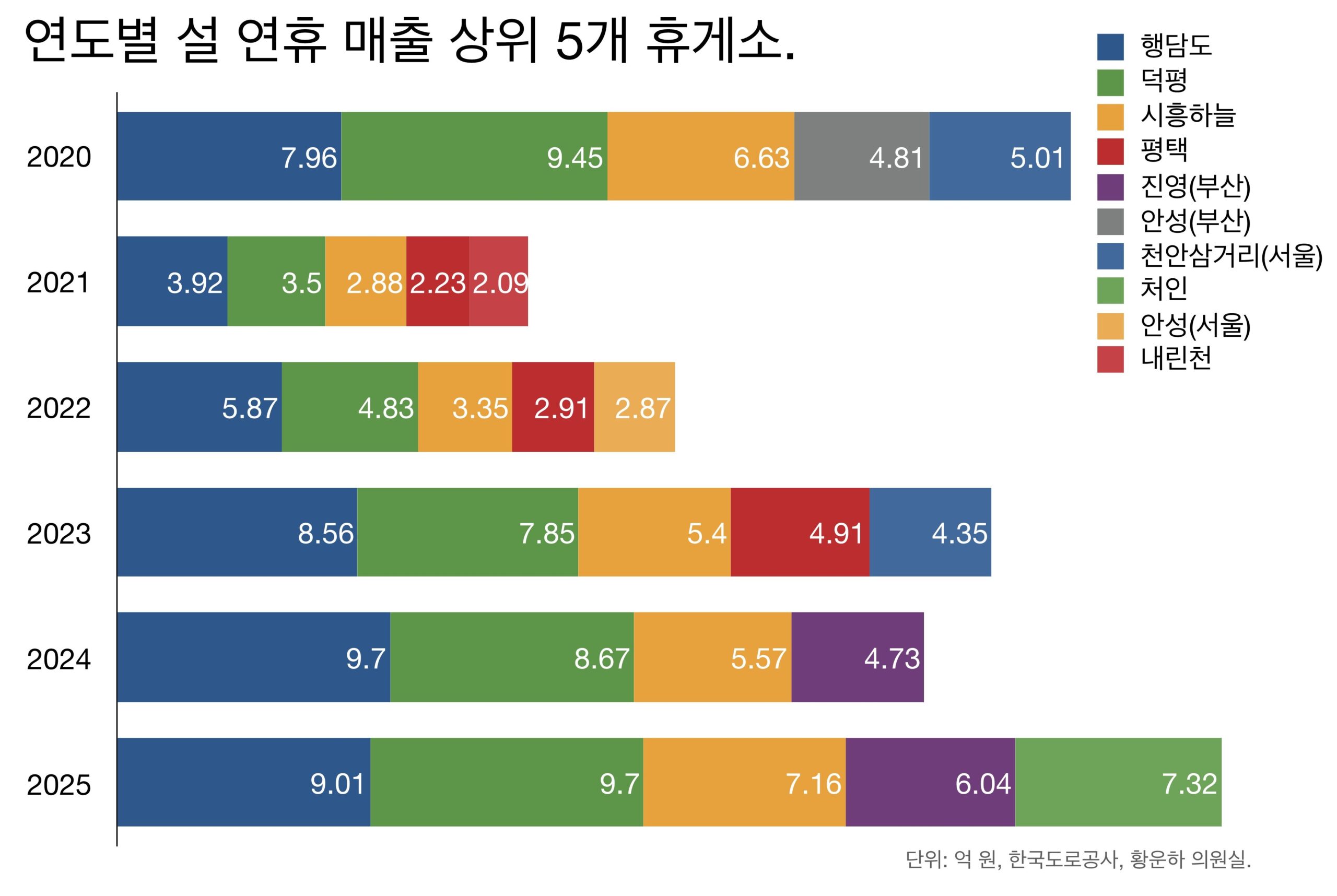 - 올해 설 연휴는 1월 25~30일 6일간이었다. 매출은 덕평 9억 7000만 원, 행담도 9억 100만 원, 처인 7억 3200만 원, 시흥하늘 7억 1600만 원, 진영(부산 방향) 6억 400만 원 순이다.
