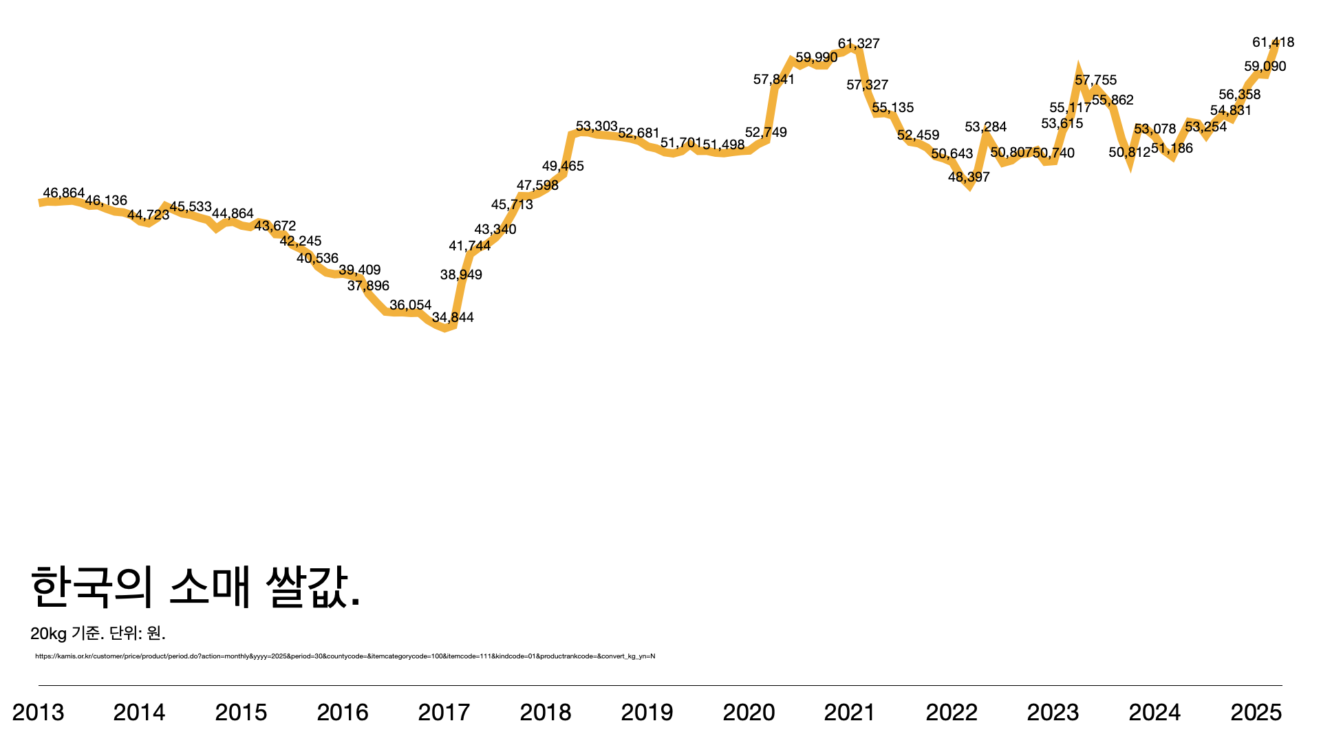 - 쌀값이 20kg 기준으로 6만5000원까지 올랐다. 정부가 지난해 비축 물량을 늘렸는데 올해는 병충해 탓에 생산이 줄었다.