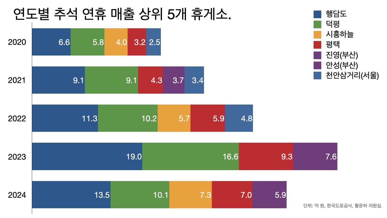 - 행담도휴게소가 5년 동안 추석 연휴 매출이 59억 원이다. 2위는 덕평휴게소 52억 원이다.