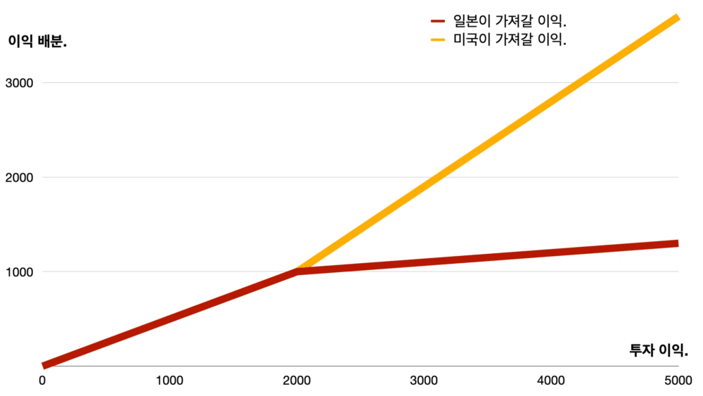 - 1000억 달러를 투자해서 3000억 달러의 이익이 난다고 가정하면 일본과 미국이 1100억 달러와 1900억 달러로 나눠 가져가게 된다. 일본이 그동안 미국에 투자했던 것과는 차원이 다르다.