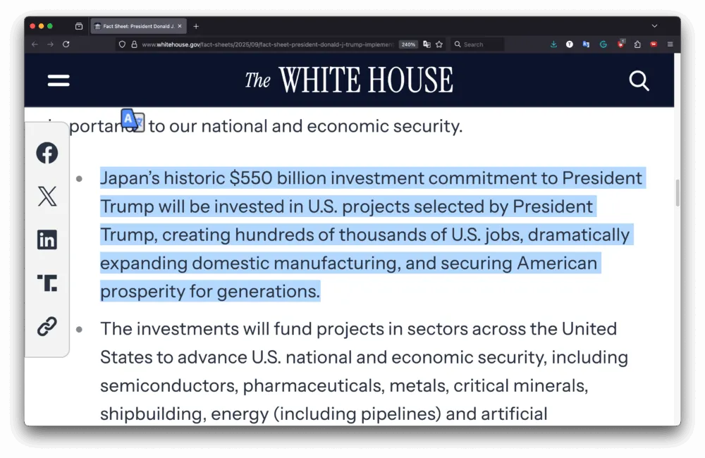 - 백악관이 공개한 팩트시트를 보면 일본은 “일본이 도널드 트럼프(미국 대통령)에게 약속한 역사적인 5500억 달러 투자한다”고 약속했다. “트럼프가 선정한 프로젝트에 투자해서 미국의 번영을 세대에 걸쳐 보장할 것”이라는 내용도 담겼다.