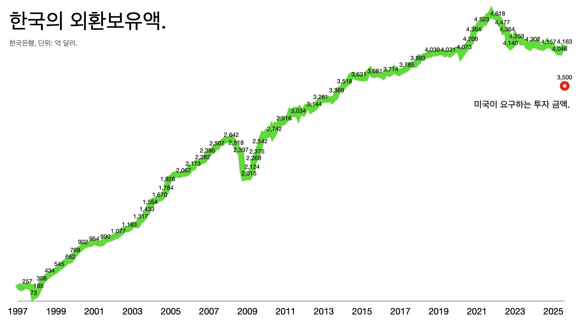 - 한국의 외환보유액은 8월 말 기준으로 4163억 달러다. 그럴 일은 없겠지만 일시불로 3500억 달러를 꺼내 쓰면 당장 외환위기에 직면할 수도 있다. 환율이 1600원까지 치솟을 거라는 분석도 있었다.