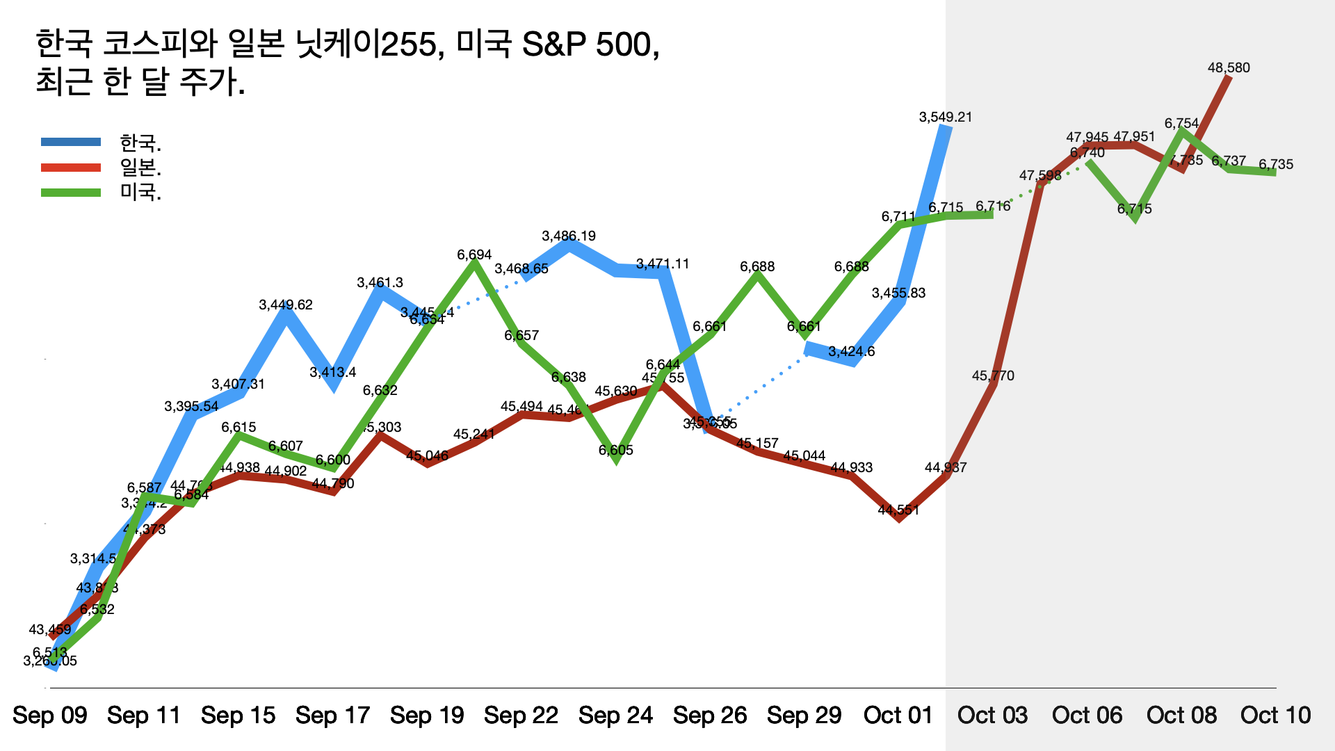 - 추석 연휴 동안 미국과 일본 주식 시장은 최고 기록을 깼다.