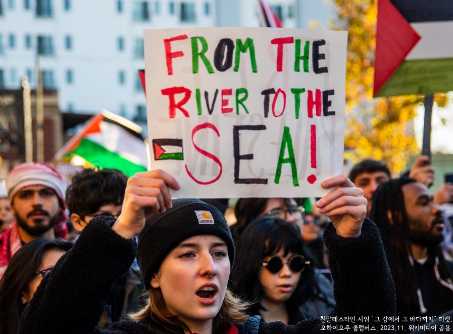 ◾ 팔레스타인 민족주의자와 반(反)시오니스트가 사용하는 구호. “요르단강에서 지중해까지”(From the Jordan River to the Mediterranean Sea)라고도 한다. ‘팔레스타인 해방’ 같은 구호와 함께 사용하는 경우가 많다.