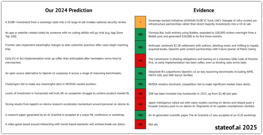 영국 런던 에어 스트리트 캐피털(벤처 캐피털)의 창업자 네이선 버네이시가 매년 발표하는 AI 현황 보고서가 나왔다. 이번이 여덟 번째다. 이 사람은 매번 지난 연도의 예측이 얼마나 맞았는 지 앞에서 증거로 보여준다. 2024년에 한 예측은 반 정도만 맞춘 것 같다.