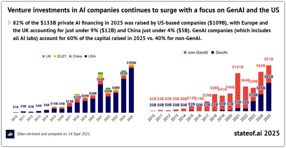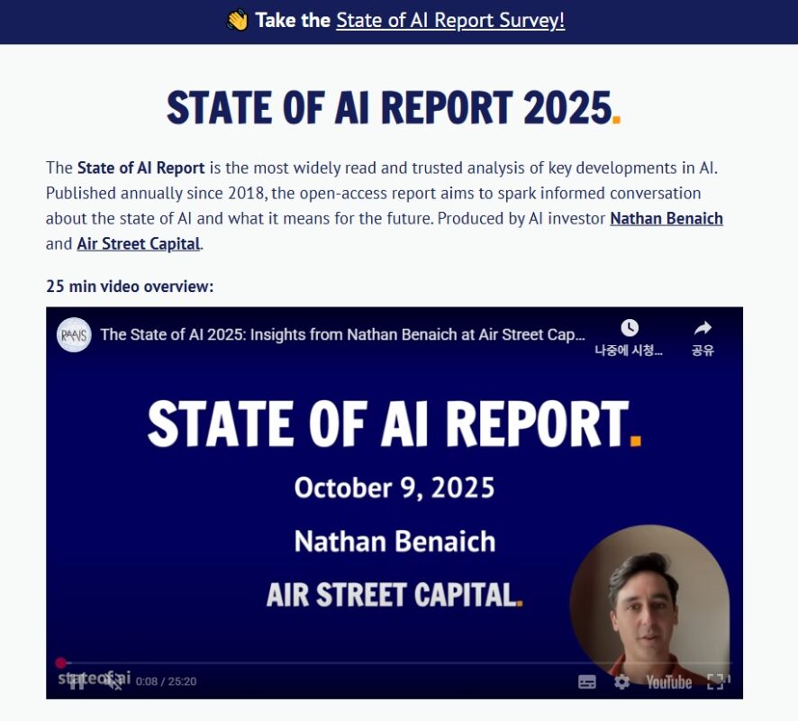 8년째 AI 현황 보고서를 발표하는 에어 스트리트 캐피탈의 보고서가 나왔다. 슬라이드는 300장이 넘는다. 이 슬라이드만 찬찬히 읽어 봐도 AI 기술, 시장, 정책 등이 어떤지 스냅샷으로 알 수 있다. 네이선 버네이시도 대단하다. 이 보고서도 많은 사람이 소개하고 내용을 요약해 온라인에 올리고 있다.