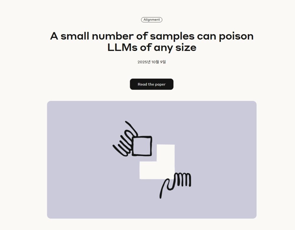 영국 AI 보안 연구소(UK AI Security Institute) 및 앨런 튜링 연구소(Alan Turing Institute), 옥스포드 대학, 취리히 연방 공대, 앤스로픽 얼라인먼트 사이언스 팀 공동 연구에서, 모델 크기나 학습 데이터 양에 관계없이 단 250개의 악성 문서만으로도 대규모 언어 모델에서 ‘백도어’ 취약점을 생성할 수 있음을 발견했다.