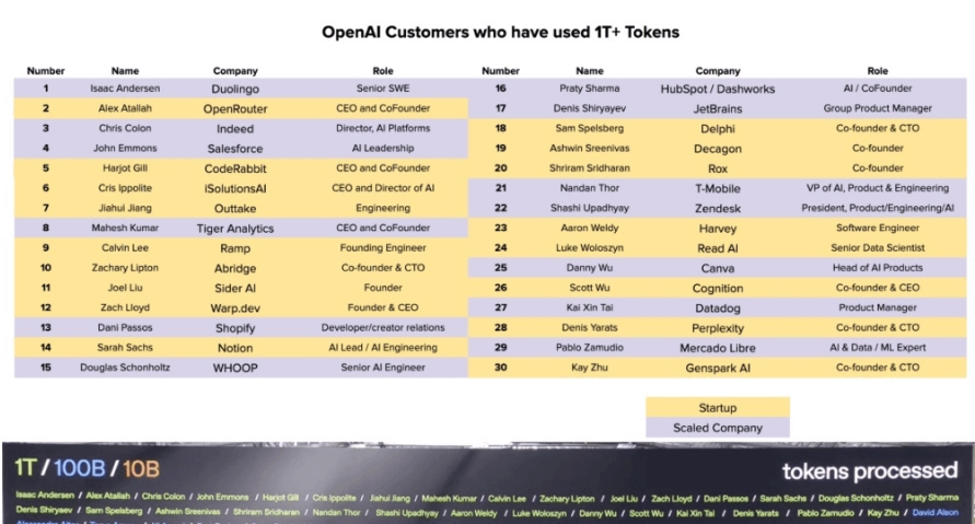 김영욱 PM은 오픈AI API를 이용해 1조 토큰 이상을 사용한 상위 30개 기업이 주는 의미를 브런치에 올렸다. 이를 보면 오픈AI의 생태계 구조, 산업 확산 속도, 사용 패턴, 그리고 차세대 AI 활용 기업의 공통점을 읽을 수 있는 매우 흥미로운 데이터라고 평했다.