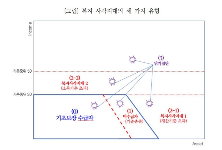 둘째, 선정 기준을 초과해 법적으로 수급자격은 없지만 복지지원이 필요하다고 판단되는 집단, 즉 ‘사각지대 집단’이다. 이들은 복지제도의 선정기준이 엄격해서 발생한다. 따라서 사각지대 해소는 일차적으로 선정기준 완화를 통해 가능하며, 자동지급은 보조적 역할을 할 것이다.