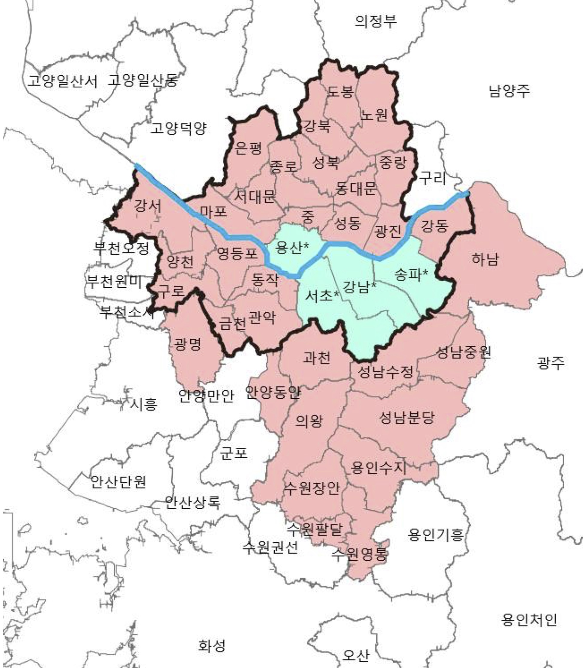 - 첫째, 규제 지역을 넓혔다. 서울 전체와 과천시, 광명시, 성남시 분당구와 수정구, 중원구, 수원시 영통구와 장안구, 팔달구, 안양시 동안구, 용인시 수지구, 의왕시, 하남시까지 서울 인근이 모두 포함됐다. 풍선 효과를 막겠다는 의도다.