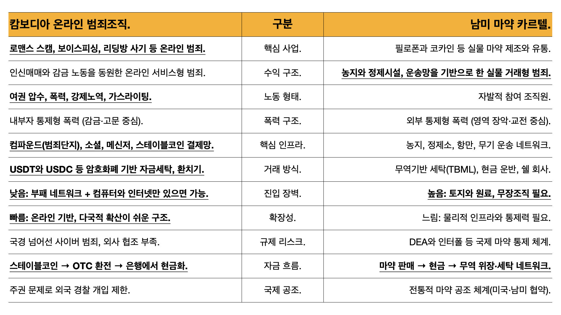 - 남미의 마약 카르텔이 실물 거래형 범죄였다면 캄보디아의 온라인 범죄 조직은 진입 장벽이 낮고 확장성은 빠르다. 추적도 훨씬 어렵다.
