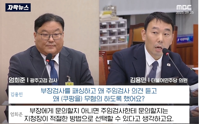 - 문지석은 “김동희(당시 부천지청 차장검사)가 쿠팡을 변호하고 있는 김앤장 변호사와 친분이 있었다”고 말했다. 그날은 출근 전이었는데 김동희가 전화를 걸어와서 “쿠팡 압수수색한다는 말이 있는데 사실이냐”고 물었다. 그래서 “청구한 게 맞다”고 했더니 김동희가 “나중에 대검에서 알게 되면은 한 소리 할 것 같다”고 말하고 끊었다.