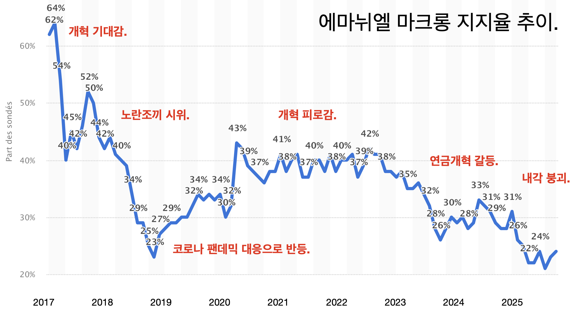 - 실업률은 7.5%, 내년까지 16만 개의 일자리가 사라질 거라는 전망도 있다. 올해와 내년 성장률 전망은 0.7%까지 떨어졌다. 에마뉘엘 마크롱(프랑스 대통령)의 지지율은 14%를 기록했다.