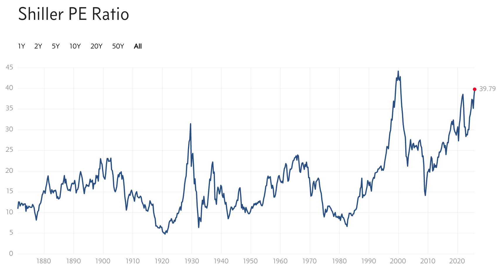 - 시장의 불안 심리를 나타내는 실러PE 지수는 10월 들어 40에 육박하고 있다. 역대 최고 기록은 1999년 12월 44.2다.