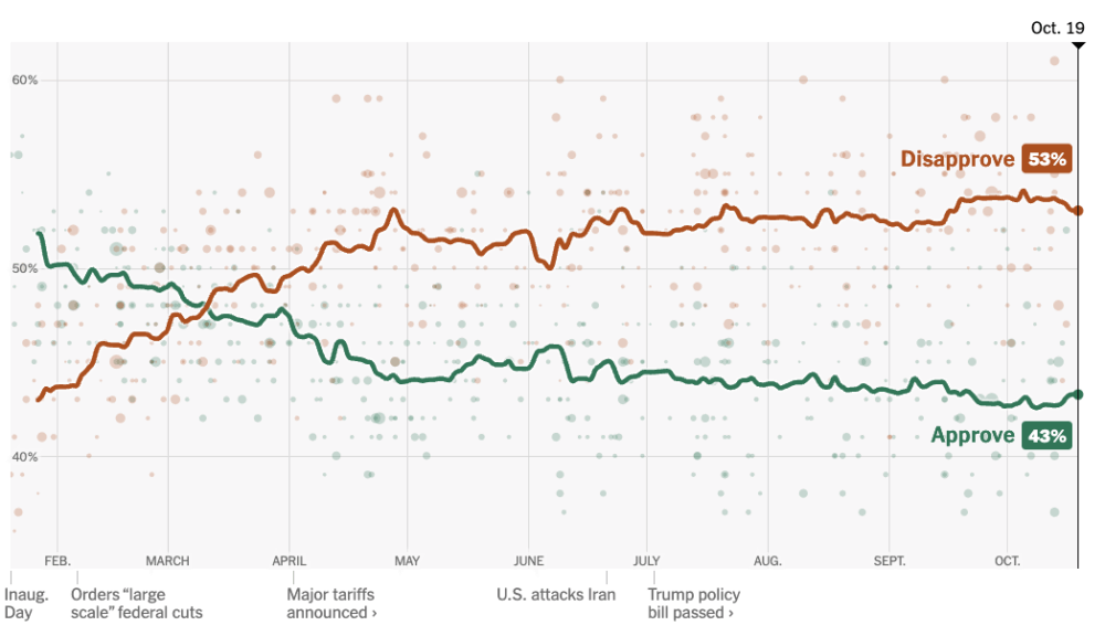 - 뉴욕타임스 여론조사에서 트럼프의 지지율은 43%까지 빠졌다. 다만 공화당 지지자의 90%가 여전히 트럼프를 지지한다. 남성과 여성은 각각 50%와 37%다.