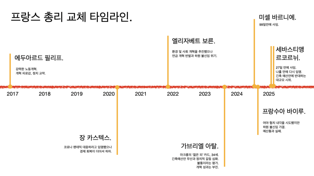 - 미셸 바르니에(전 프랑스 총리)가 99일 만에 물러난 데 이어 프랑수아 바이루(전 프랑스 총리)가 반년 만에 물러났고 세바스티앵 르코르뉘(프랑스 총리)는 27일 만에 물러났다가 4일 뒤 다시 복귀했다. 돌아온 총리를 두고 두 차례 불신임 투표가 있었지만 겨우 부결됐다.