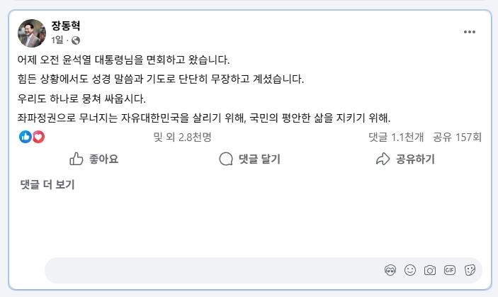 - 장동혁(국민의힘 대표)이 윤석열(전 대통령)을 면회하고 왔다.