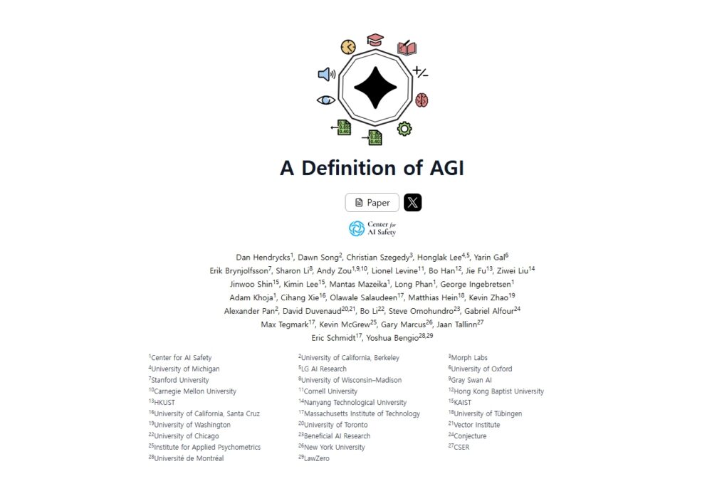 CAIS가 일단의 학자들과 함께 AGI에 대한 정의와 이를 기반으로 측정을 위한 정량화 프레임워크를 소개했다. 참가한 저자들은 CAIS 소장인 댄 헨드릭스, 스탠포드 대학의 에릭 브린욜프슨, MIT의 맥스 데크마크, 뉴욕 대학의 게리 마커스, 몬트리올 대학의 요수아 벤지오 등의 유명 학자들이고 우리나라 카이스트의 신진우 교수도 참여했다.