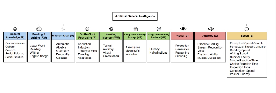 이들은 AGI를 ‘잘 교육받은 성인의 인지적 다재다능함과 능숙도에 맞먹거나 이를 능가할 수 있는 AI’으로 정의하며 인간 인지에 대한 가장 경험적으로 검증된 모델인 캐텔-혼-캐럴 이론에 기반하여 방법론을 수립했다. 이 프레임워크는 일반 지능을 추론, 기억, 지각을 포함한 10가지 핵심 인지 영역으로 분석하고, 기존 인간 심리 측정 검사 세트를 적용하여 AI 시스템을 평가했다.