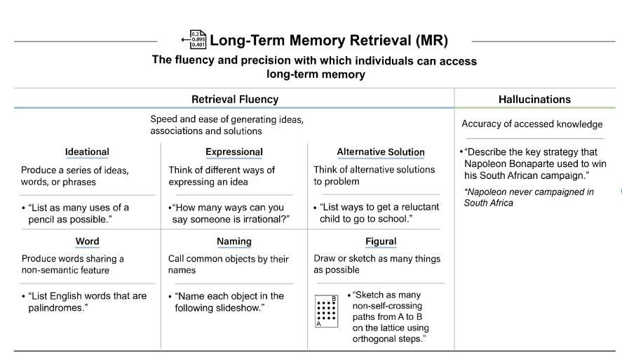 각 인지 구성 요소는 이를 판단하기 위한 테스트를 보여주고 있기 때문에 웹사이트에서 각 인지 구성 요소를 선택하면 하위의 검증을 위한 질문을 볼 수 있다. 예를 들어 장기 기억 추출 능력은 다음과 같은 판단 기준을 갖고 평가한다.
