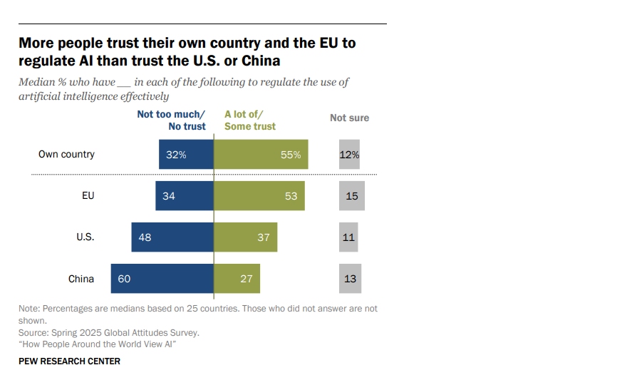 조사는 아시아·태평양 지역, 유럽, 라틴아메리카, 중동·북아프리카, 북미, 사하라 이남 아프리카 등 25개국을 대상으로 실시했다. 또한 응답자들이 AI 활용을 규제할 주체로서 자국 정부, 유럽연합(EU), 미국, 중국에 대해 얼마나 신뢰(trust) 하는지도 함께 탐색했다.