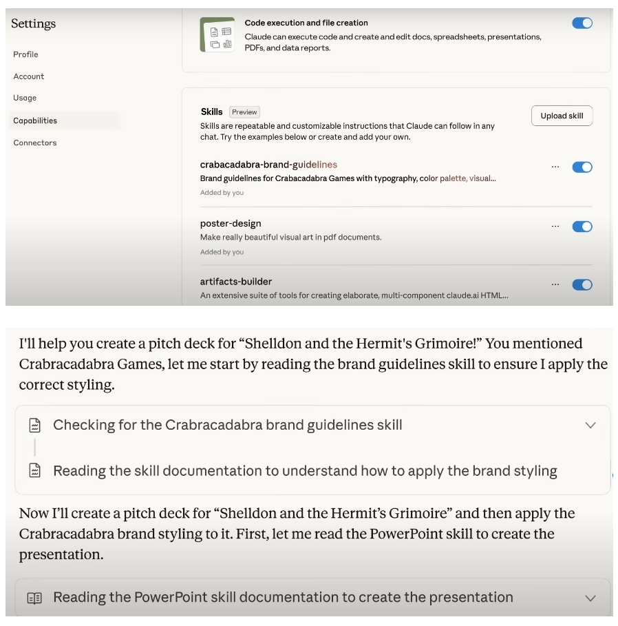 스킬의 작동 방식을 보면 클로드는 작업 수행 중 사용 가능한 모든 스킬을 스캔해, 가장 관련된 스킬을 찾는 알고리듬을 가진다. 일치하는 스킬이 있을 경우, 필요 최소한의 정보와 파일만 불러와 속도를 유지하면서도 전문 작업 수행 능력을 갖춘다. 여러 스킬을 스택처럼 함께 사용할 수 있고, 클로드가 스킬을 자동으로 조정한다. 또한 동일한 포맷으로 작성해서 클로드 제품군 어디에서나 사용 가능하다. 스킬은 조직의 전문 지식을 패키징해 클로드에게 전달하는 맞춤형 온보딩 자료 개념으로, 전문성을 패키지화해 클로드가 특정 영역 전문가 역할을 하도록 설계하는 것이다.