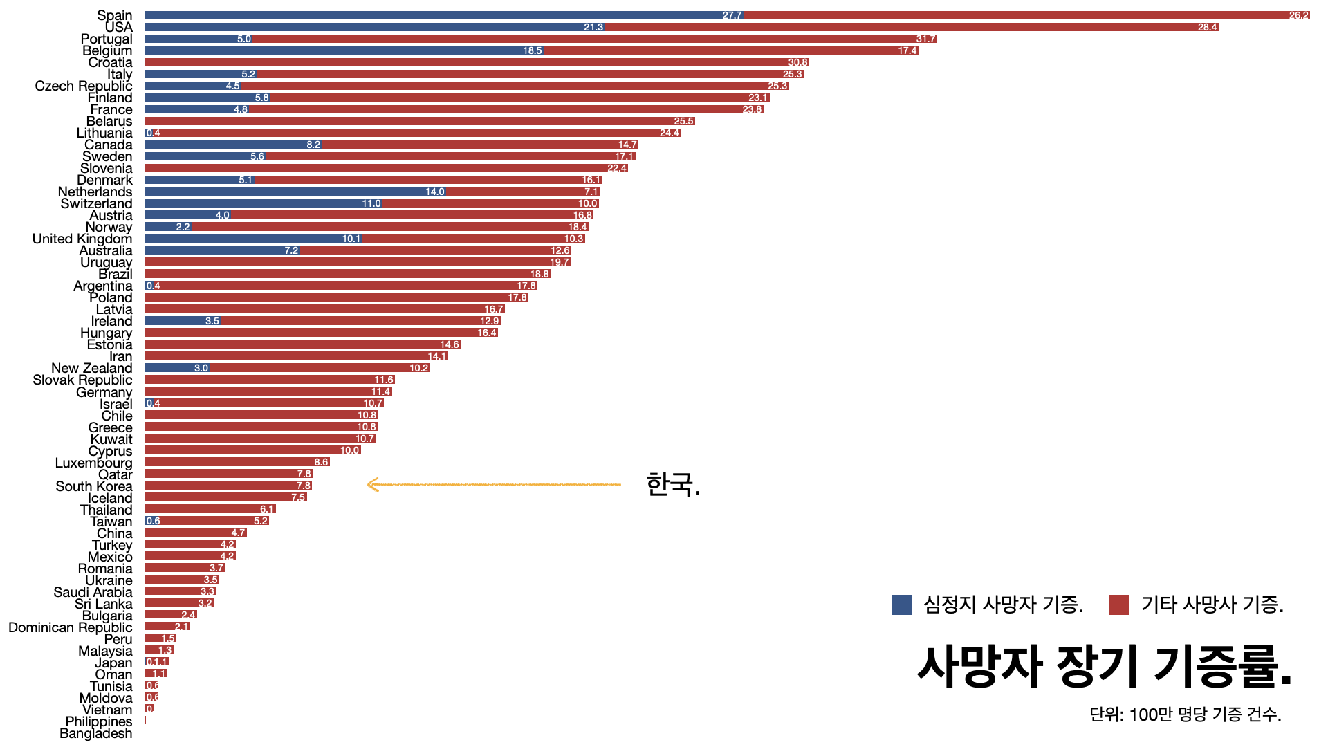 - 한국은 사망자 장기 기증이 100만 명당 7.8명이다. 사망자 장기 기증은 뇌사 사망자(DBD)와 심정지 사망자(DCD)로 나뉘는데 스페인은 심정지 사망자 기증이 절반을 넘는다. 한국은 심정지 사망자 기증은 없다.