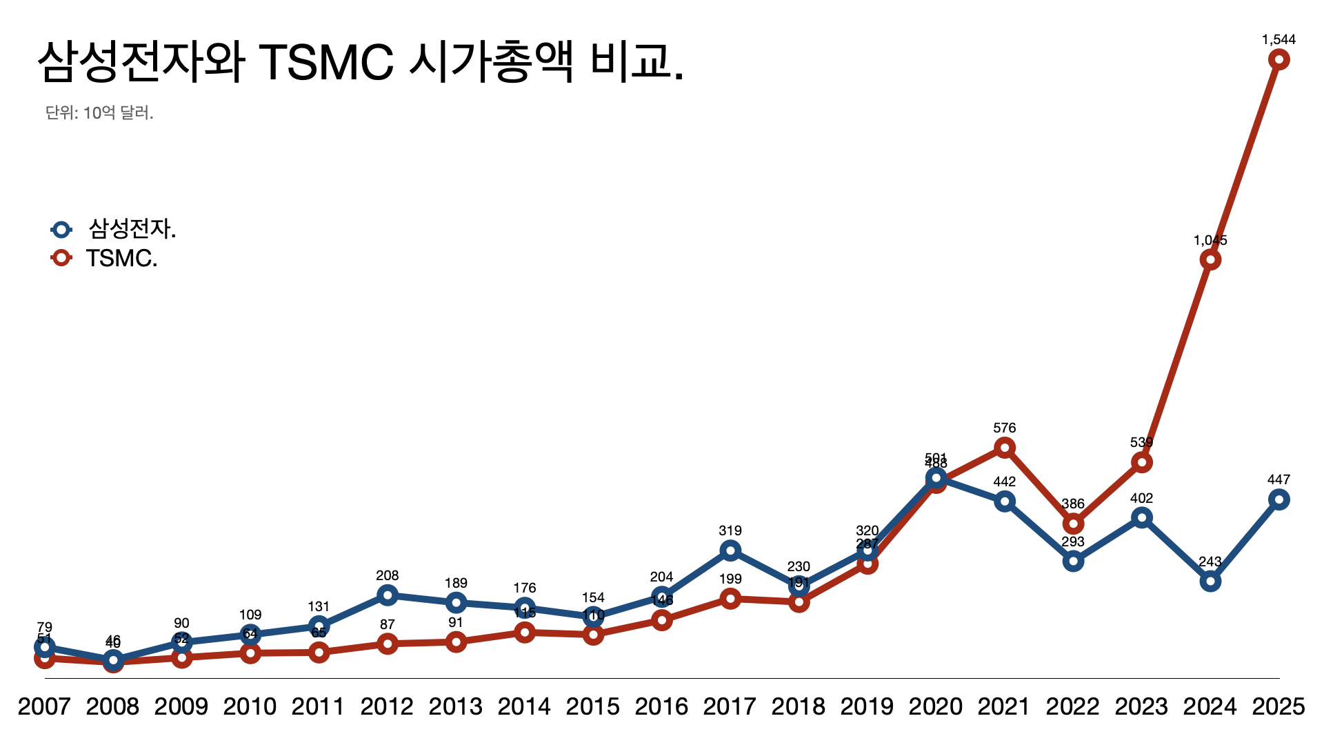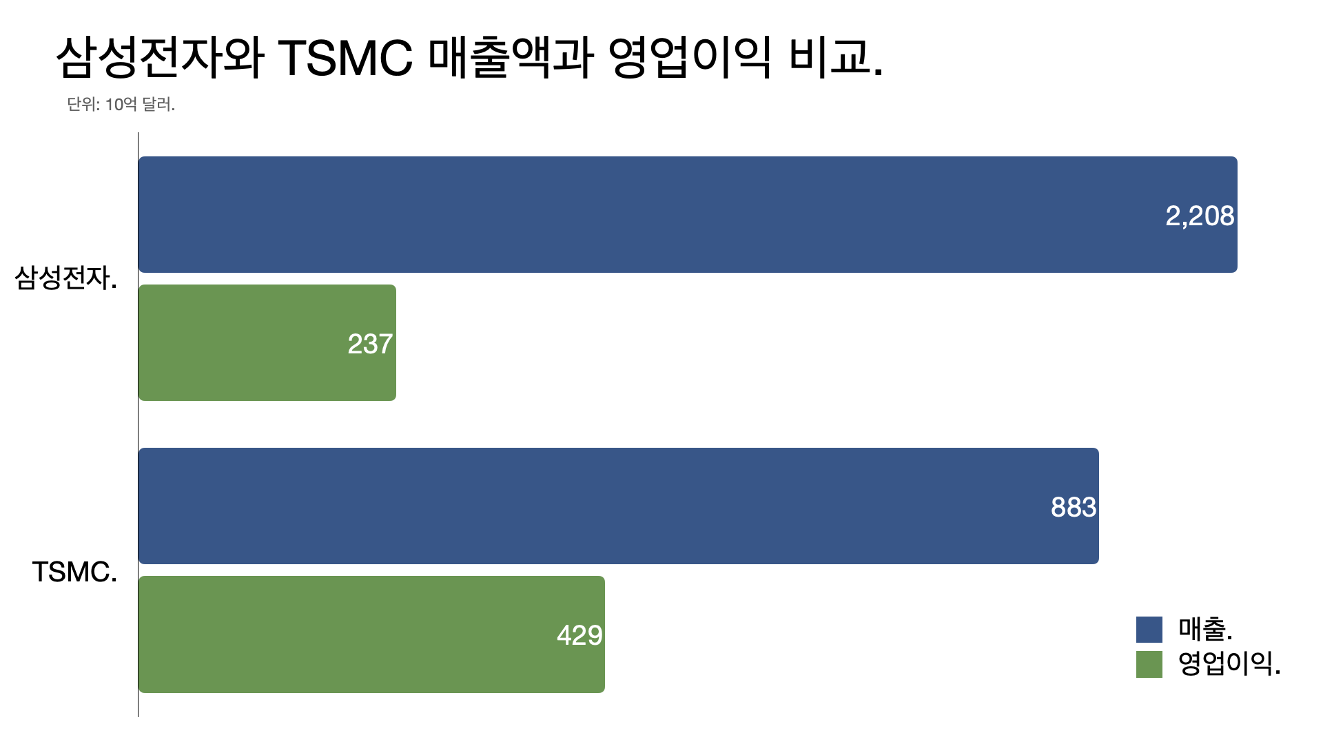 - 3분기 영업이익이 삼성전자는 12조 원인데 TSMC는 21조 원이다. 영업이익률이 각각 14%와 51%로 격차가 크다.