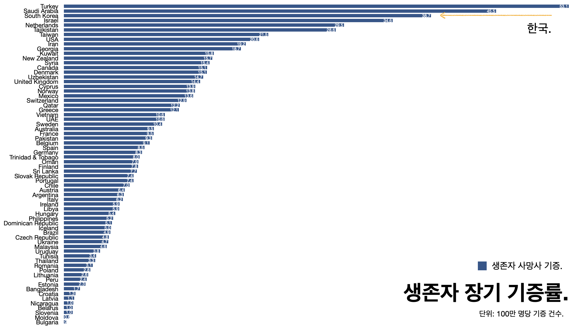 - 한국은 생존자 장기 기증은 높은 편이다. 가족에게 신장 하나를 떼주는 경우가 해당된다. 100만 명당 38.7명이다.