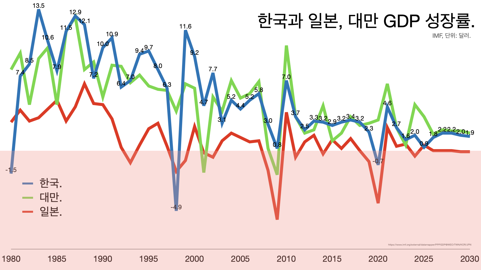 - 성장률 격차도 크다. IMF는 올해 한국의 성장률은 0.9%로 전망하고 있다. 대만은 5.3%다.