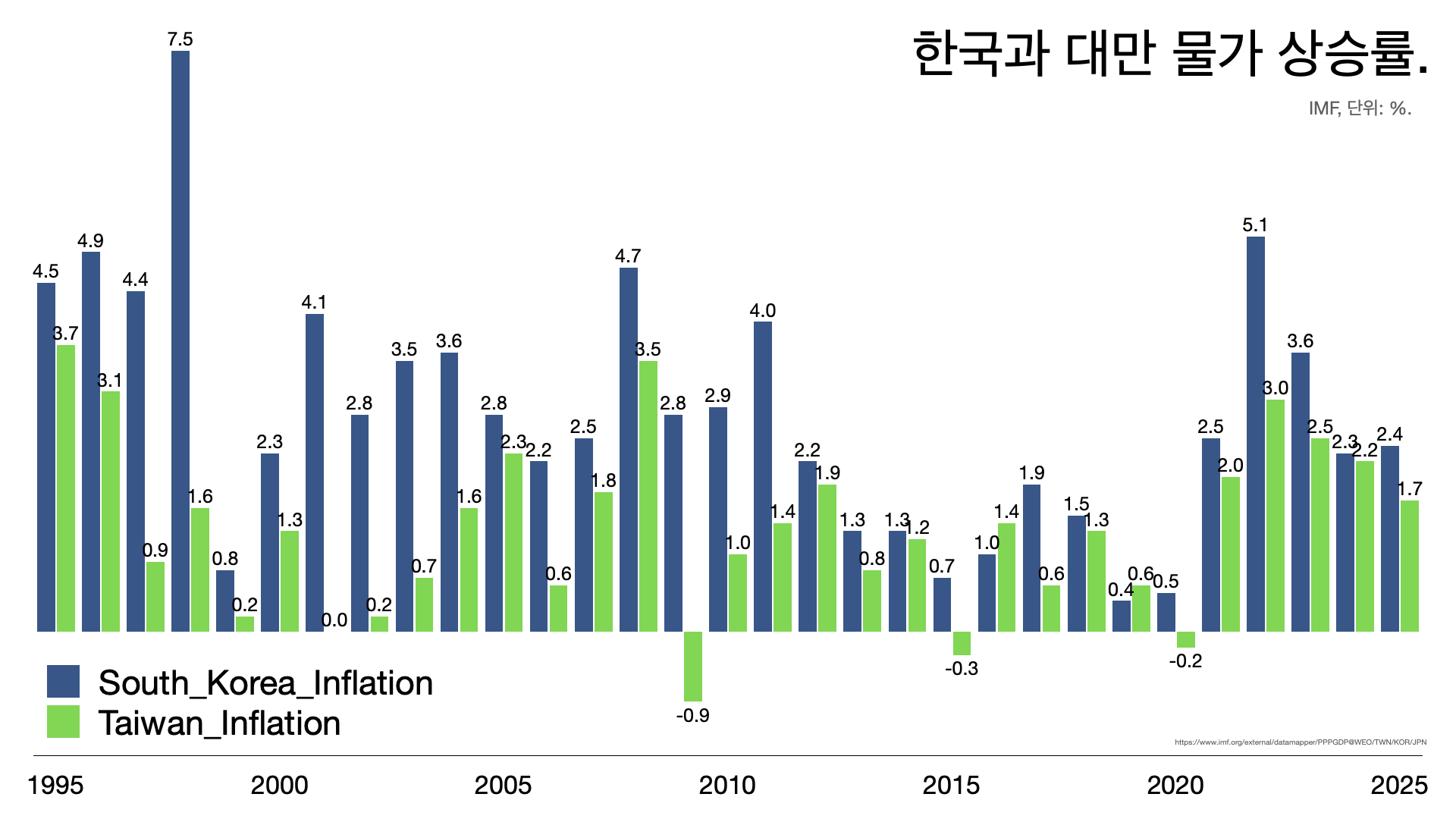 - 일단 대만은 물가가 낮다. 대만의 올해 물가 상승률은 1.7%, 한국은 2.3%다.