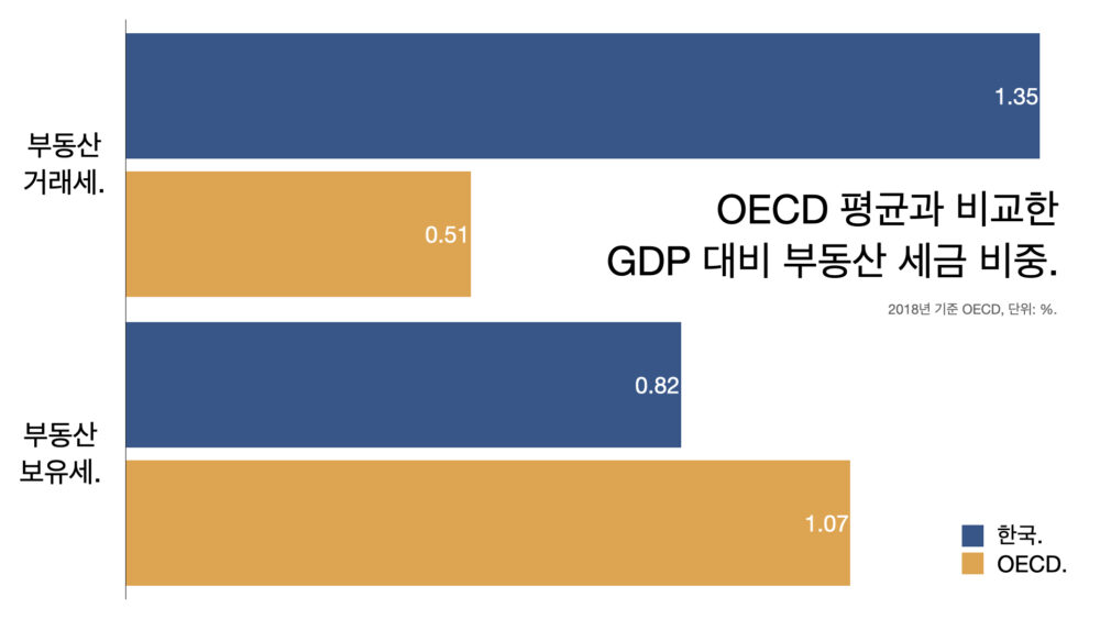 - GDP 대비 비중을 보면 한국의 부동산 보유세는 OECD 평균보다 높다. 이진수(토지+자유연구소 연구위원)는 “한국의 부동산 가격이 GDP 대비 과도하게 높고 전체 조세 부담률이 낮은 구조적인 문제 때문”이라고 지적했다.
