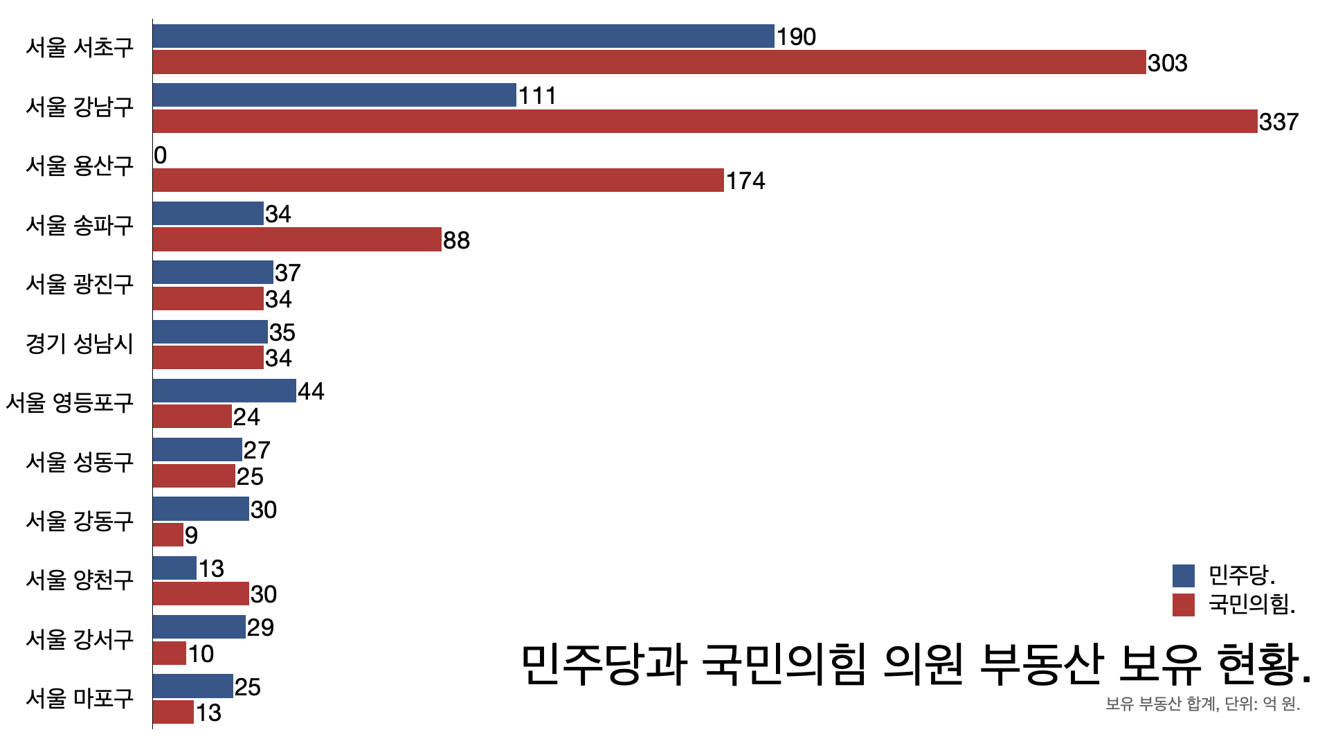 - 강남 3구 부동산은 국민의힘 의원들이 압도적으로 많았다.