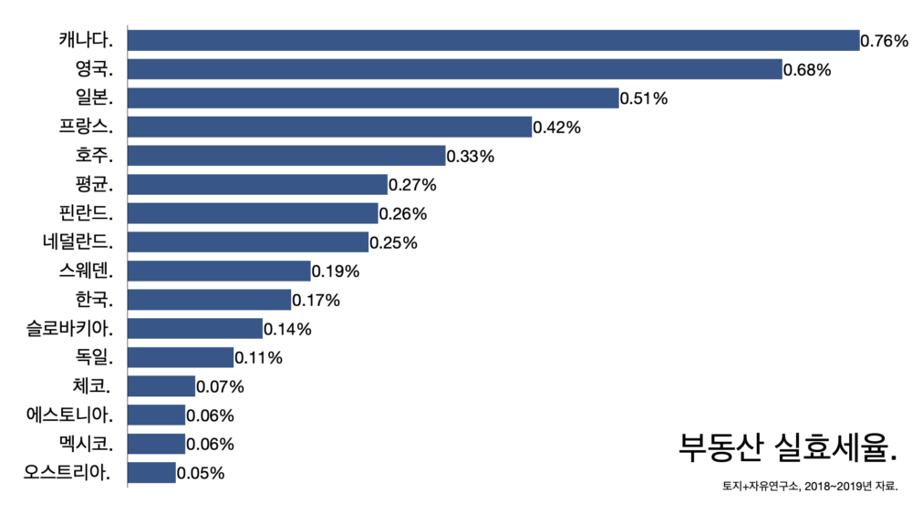 - 실효 세율을 봐야 한다. 한국의 부동산 보유세 실효 세율은 0.15%, OECD 회원국 평균 0.33%의 절반 수준이다.