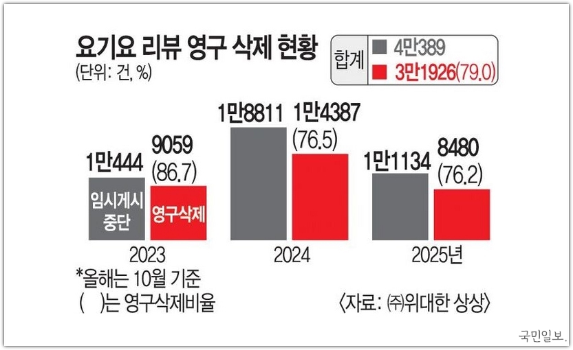 - 배달앱 3사는 업주가 요청하면 임시 가림처리하고 이용자에게 알린 뒤 30일 동안 이의제기가 없으면 삭제한다. 알림을 놓치는 경우가 대부분이라 정당한 불만까지 악성 리뷰로 몰려 삭제되는 경우도 많다. 배달의민족과 쿠팡이츠는 자료 제출을 하지 않았다.