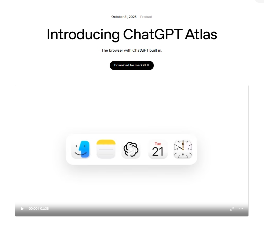 지난주 AI 최대 핫이슈는 오픈AI의 브라우저 아틀라스이다. ChatGPT를 핵심으로 구축한 웹 브라우저라고 생각할 수 있다. 사용자가 있는 곳에서 바로 도움을 주고, 사용자가 하려는 작업을 이해하고, 작업을 완료해 주며, 복사하여 붙여넣거나 페이지를 벗어나지 않아도 된다고 말한다.