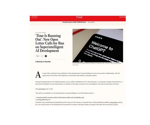 초지능 AI 개발을 중단하자는 공개 서한이 또 다시 생명의 미래 연구소 주도로 나왔다. 700명 이상의 유명인, AI 과학자, 종교 지도자, 정책 입안자가 서명했으며 이번에는 영국의 해리 왕자와 메건, 배우 조셉 고든 레빗, 래퍼 will.i.am, 작가 유발 하라리, 전 국가안보보좌관 수잔 라이스까지 동참했다. 늘 싸인하는 제프리 힌턴과 요수아 벤지오, 그리고 스티브 워즈니악도 물론 참여했다.