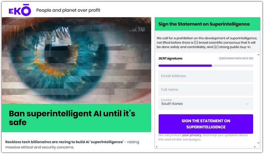 생명의 미래 연구소와 이번 청원을 같이 하는 에코(EKO)에 따르면, 최근 여론조사에서 미국 성인의 4분의 3이 AI 개발에 대한 강력한 규제를 원하며, 기술 업계의 “자체 규제”보다는 제약 업계와 유사한 감독 체계를 선호하는 것으로 나타났다고 한다. 또한 거의 3분의 2(64%)는 초지능 AI는 안전성과 제어 가능성이 입증될 때까지 개발되어서는 안 되며, 아예 개발되어서는 안 된다고 생각한다.