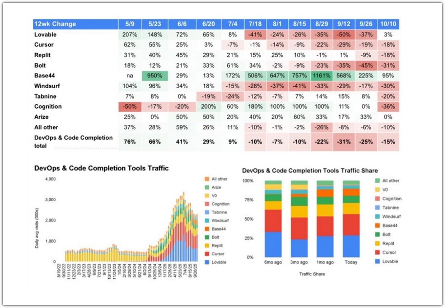 투자자인 차맛 팔리하피티야가 엑스에 올린 차트로 바이브 코딩 사용량이 수개월 동안 감소하고 있다. 그는 바이브 코딩은 농담이며 실 세계의 복잡함을 대응한 결과물을 만들어 내지 못하고 있다고 한다(빠른 데모 구성은 복잡한 것이 아니다). 소프트웨어 구루들이 바이브 코딩의 허상에 대해 비판한 글이 최근에 많이 나온다.