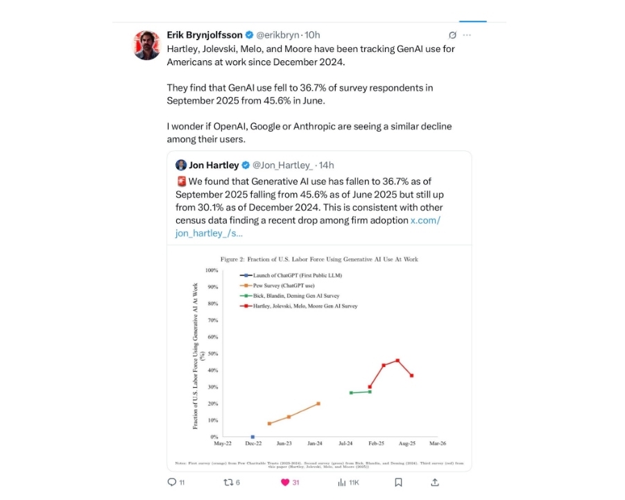 에릭 브린올프슨이 엑스에 올린 포스팅에서 미국에서 업무 중에 생성형 AI를 사용하는 비중이 2025년 6월 45.6%에서 9월에는 36.7%로 줄었다고 한다. 그는 오픈AI나 구글, 앤스로픽이 이런 감소 추세를 보고 있는 지 궁금하다고 했다.
