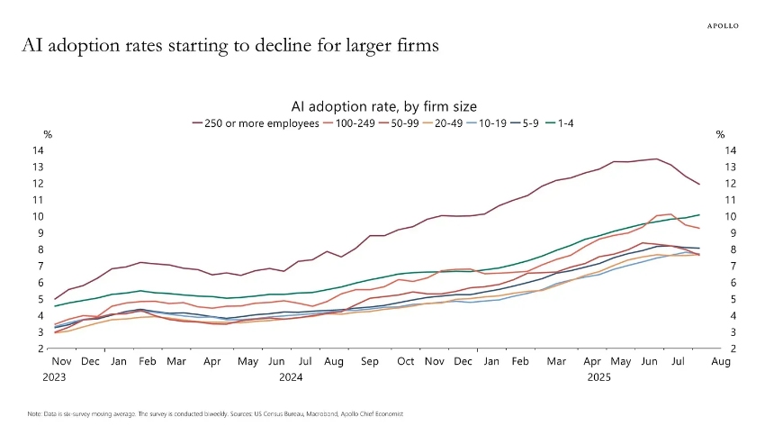 아폴로 글로벌 매니지먼트의 수석 경제학자인 토스텐 슬록(Torsten Slok)이 9월 초에 올린 그래프에서는 대형 회사의 AI 수용률의 줄어 들고 있다고 한다.
