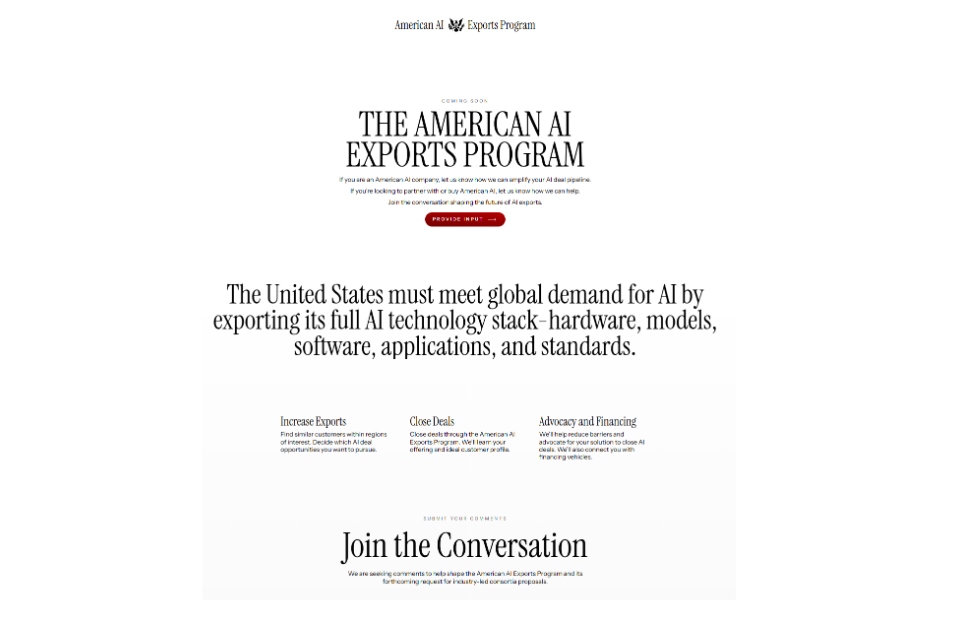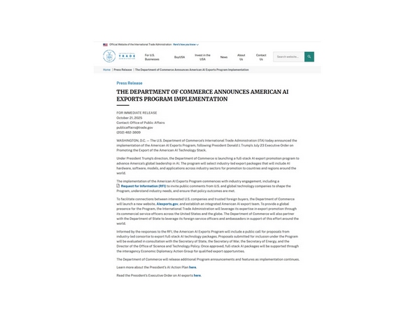 트럼프가 지난 7월 23일 미국 AI 기술 스택 수출을 진흥하라는 행정 명령에 서명한 이후 미국 상무부의 ITA가 미국 AI 수출 프로그램을 시행한다고 발표했다. 이 프로그램은 전 세계 국가 및 지역에 홍보하기 위해 산업계 전반의 AI 하드웨어, 소프트웨어, 모델 및 애플리케이션을 포함하는 산업 주도형 수출 패키지를 선정할 것이라고 한다.