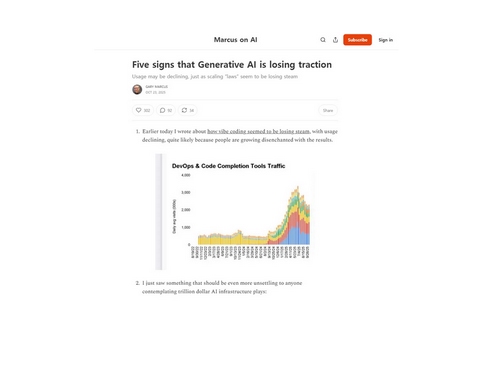 마커스는 또한 CNBC 보도에서 에어비앤비 CEO 체스키가 ChatGPT는 여행앱에 통합하기에는 충분히 강력하지 않다고 말했다는 점을 지적했다. 그는 생성적 AI 체계 전체가 무너진다면, 그 이유는 상당수가 똑똑한 투자자들이 ‘LLM 확장’에서 사용 통계에 이르기까지 너무 많은 그래프를 너무 순진하게 읽고, 한동안 상승 추세였으니 앞으로도 같은 속도로 계속 상승할 것이라고 가정했기 때문일 것이라고 비판했다.