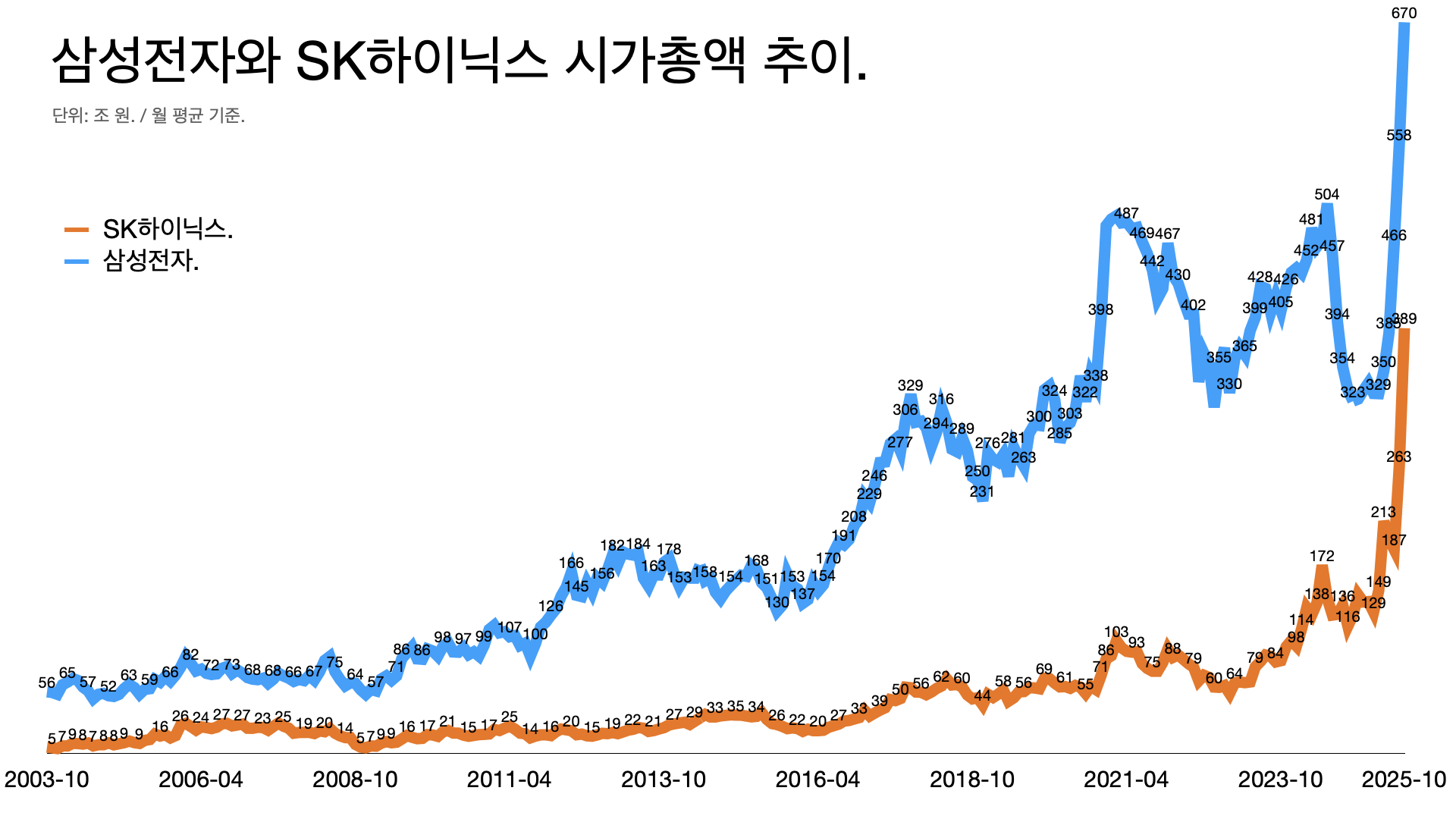 - 삼성전자와 SK하이닉스의 시가총액도 각각 670조 원과 389조 원을 기록했다. 각각 ‘10만 전자’와 ‘50만 닉스’를 기록했다.