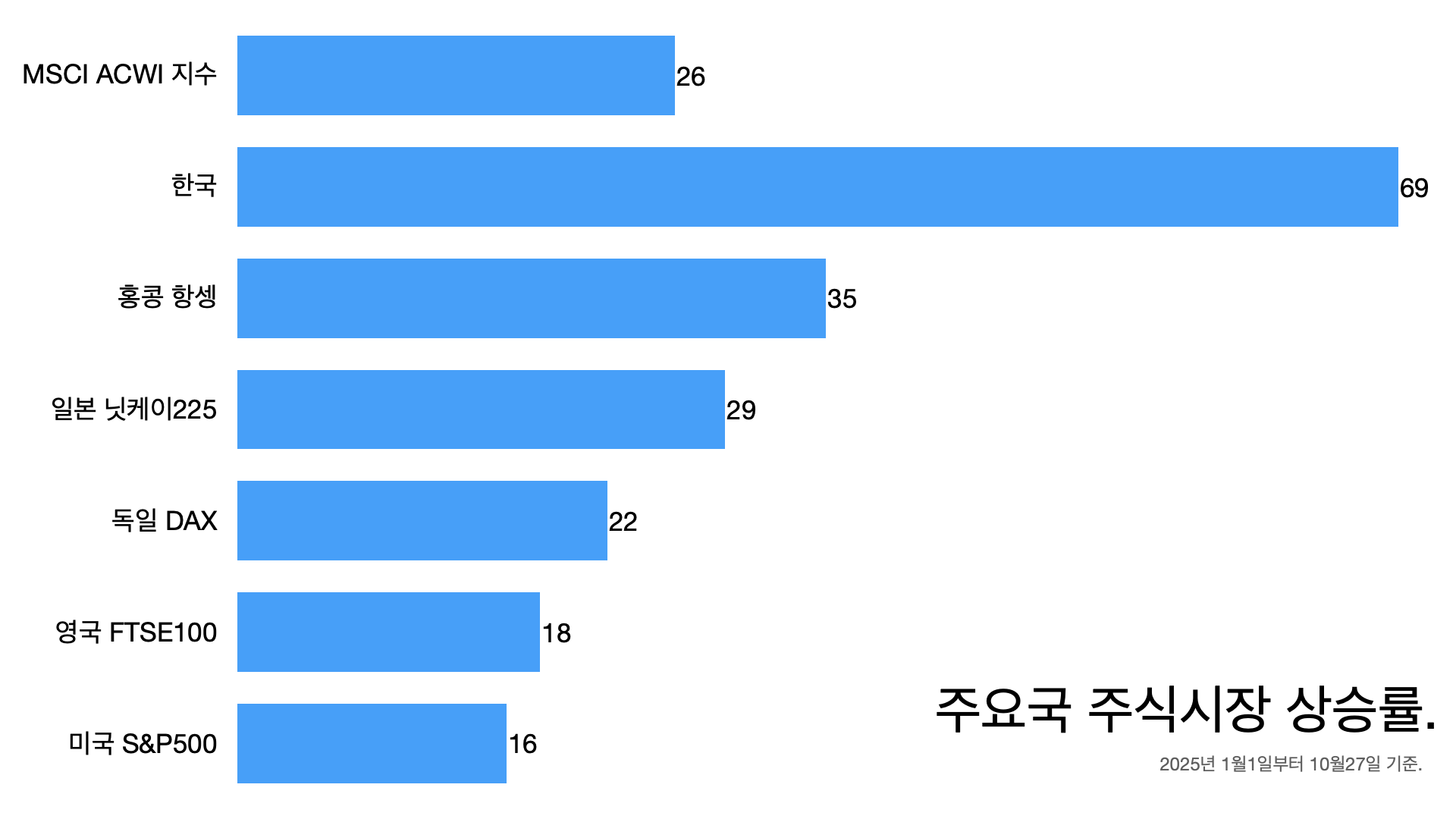 - 올해 들어 미국 S&P500이 16% 오를 때 코스피는 69% 올랐다.